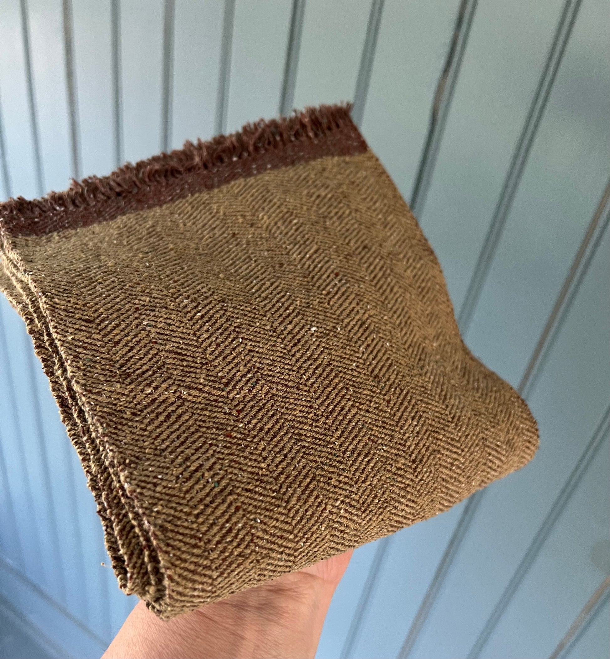This beautiful scarf is woven using Japanese Silk, the warp is a tweed light brown and the weft is a sage green tweed I hem stitched the ends and left a small fringe